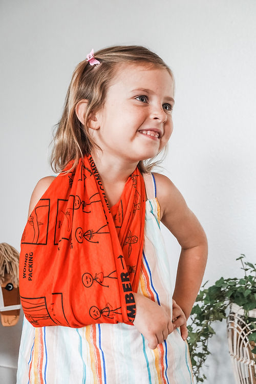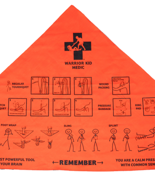 Tourniquets, slings, splints, wound packing, ring pad, pressure bandage, face mask, hair tie, hand and feet wrap, head covering, and more. The Warrior Kid Medic Multi-Tool is the ultimate all-in-one. Great for kids and adults! Training Videos always on our site & YouTube channel!
